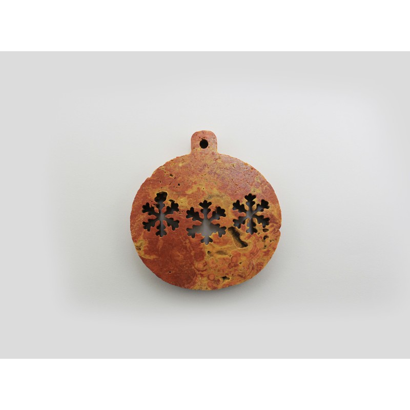 DECORAZIONE NATALIZIA- PALLINA DI NATALE IN TRAVERTINO ROSSO CON FIOCCHI DI NEVE INCISI