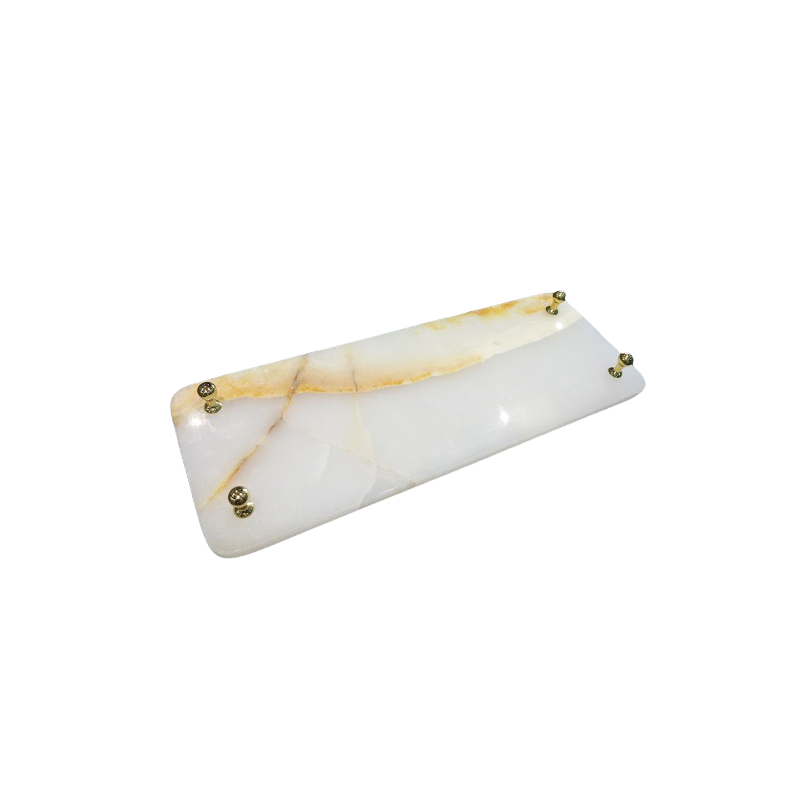 Scopri l'eleganza senza tempo con il nostro esclusivo vassoio in onice, un accessorio sofisticato che eleva ogni ambiente con un tocco di lusso. Realizzato in pregiato onice, questo vassoio vanta raffinati dettagli in colore oro che ne esaltano il design e aggiungono una nota di classe. Perfetto per servire cibi e bevande con stile, oppure come elemento decorativo di grande impatto, è l'accessorio ideale per chi desidera unire funzionalità e bellezza.